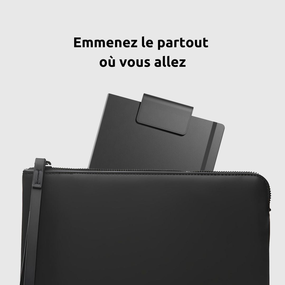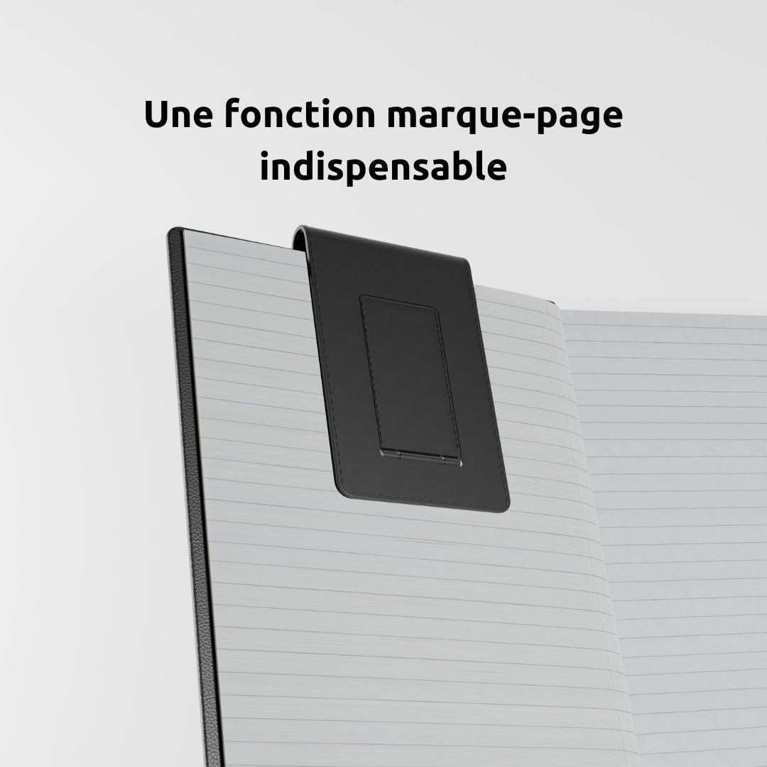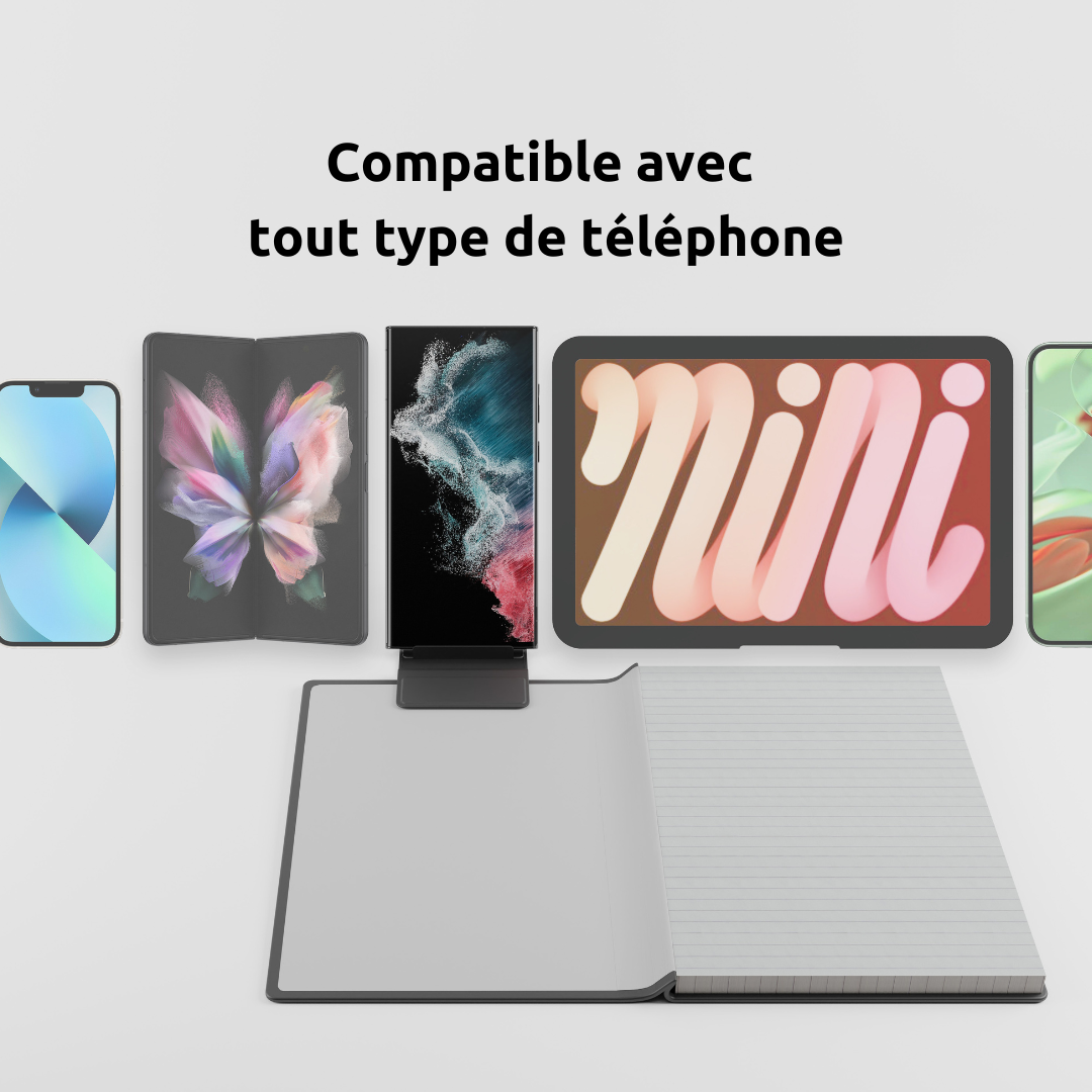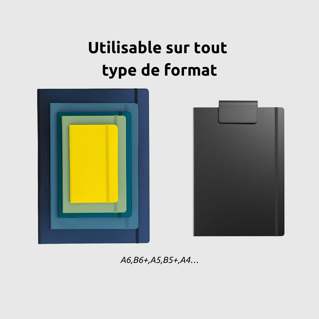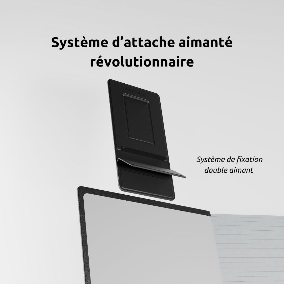 The Phoneside Note is compatible with all notebook, exercise book or notepad formats (A6, B6+, A5, B5+, A4, etc.), regardless of the thickness of their cover.