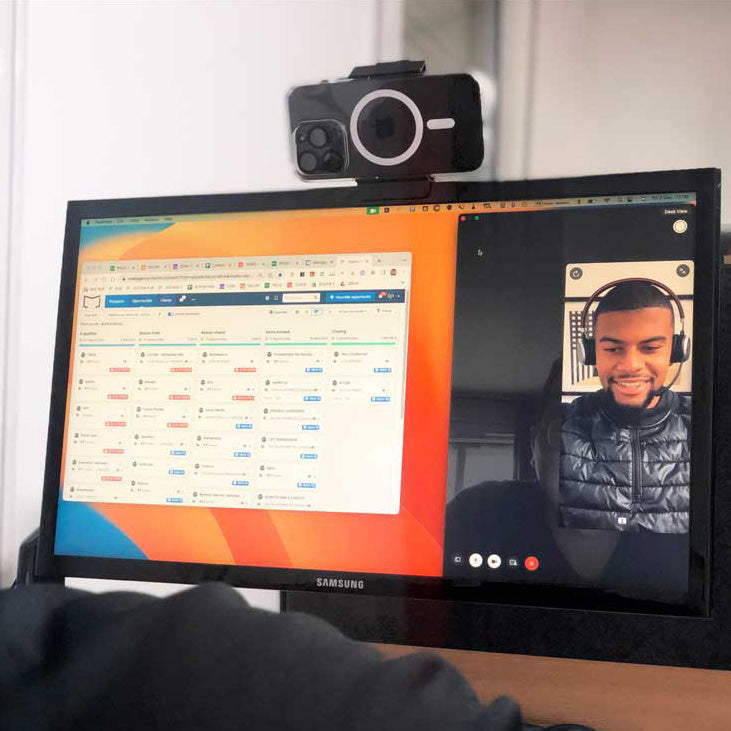Grâce à la nouvelle fonctionnalité macOS, il est maintenant possible d'utiliser votre iPhone comme webcam : il suffit de clipser votre Phoneside One sur le haut de votre écran pour gagner en confort lors de vos visioconférences !